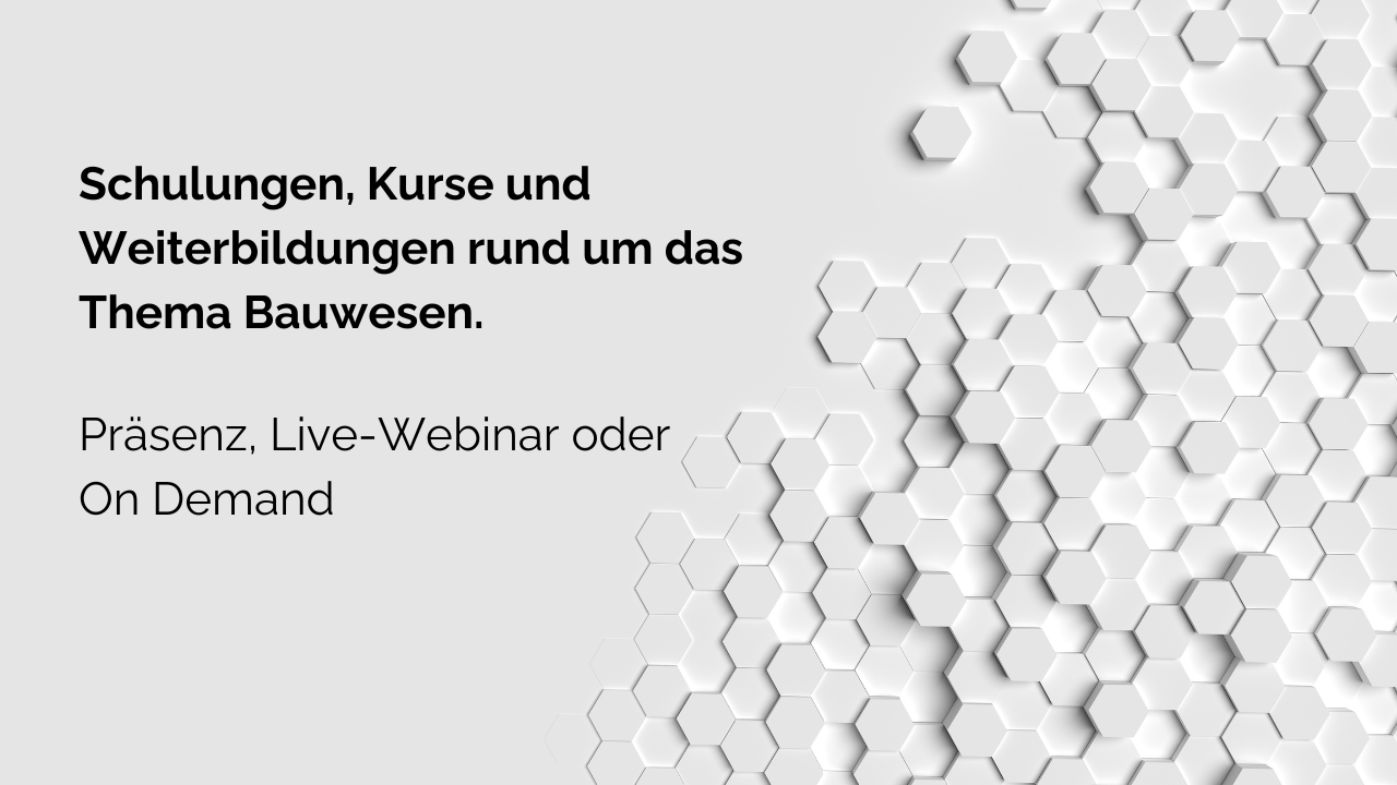 Bereit, den nächsten Schritt in deiner Karriere zu machen? Buche jetzt unsere spezialisierten Bauwesen-Kurse und profitiere von unserer langjährigen Erfahrung und Expertise. Egal ob Live-Webinare, On-Demand-Kurse oder Präsenzveranstaltungen – wir bieten dir die passende Weiterbildung für deinen Erfolg.